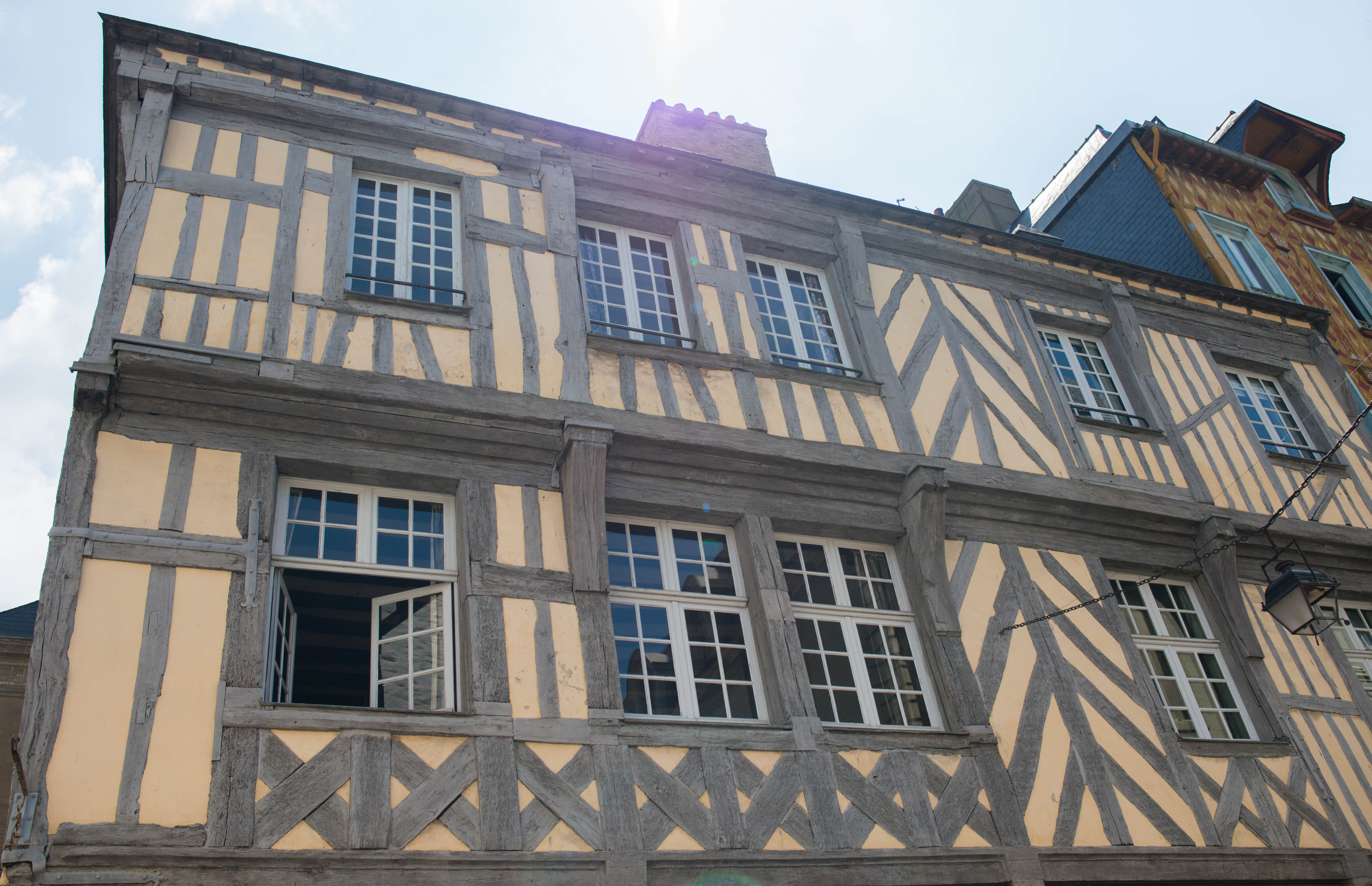 💬 Chambres d'hôtes élégantes dans bâtiment à colombages, hébergements personnalisés et terrasse intérieure.