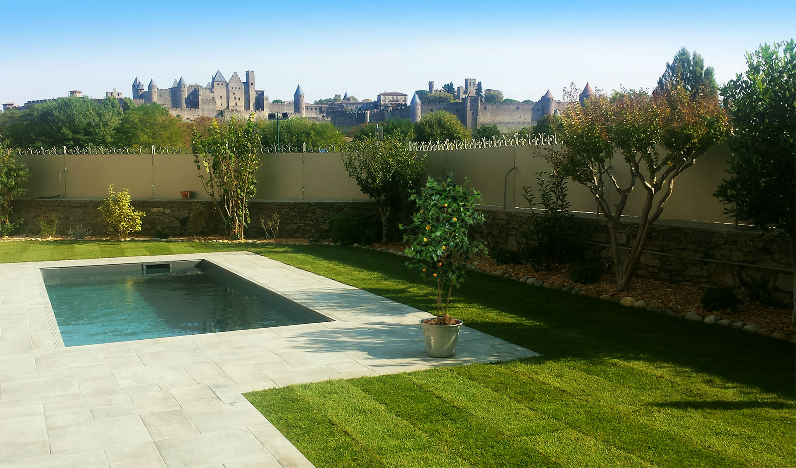 Très belle chambre et salle de bain décoré avec goût. Petite terrasse pour prendre petit déjeuner avec une vue exceptionnelle sur la cité de Carcassonne et a piscine pour vous détendre avec transat.