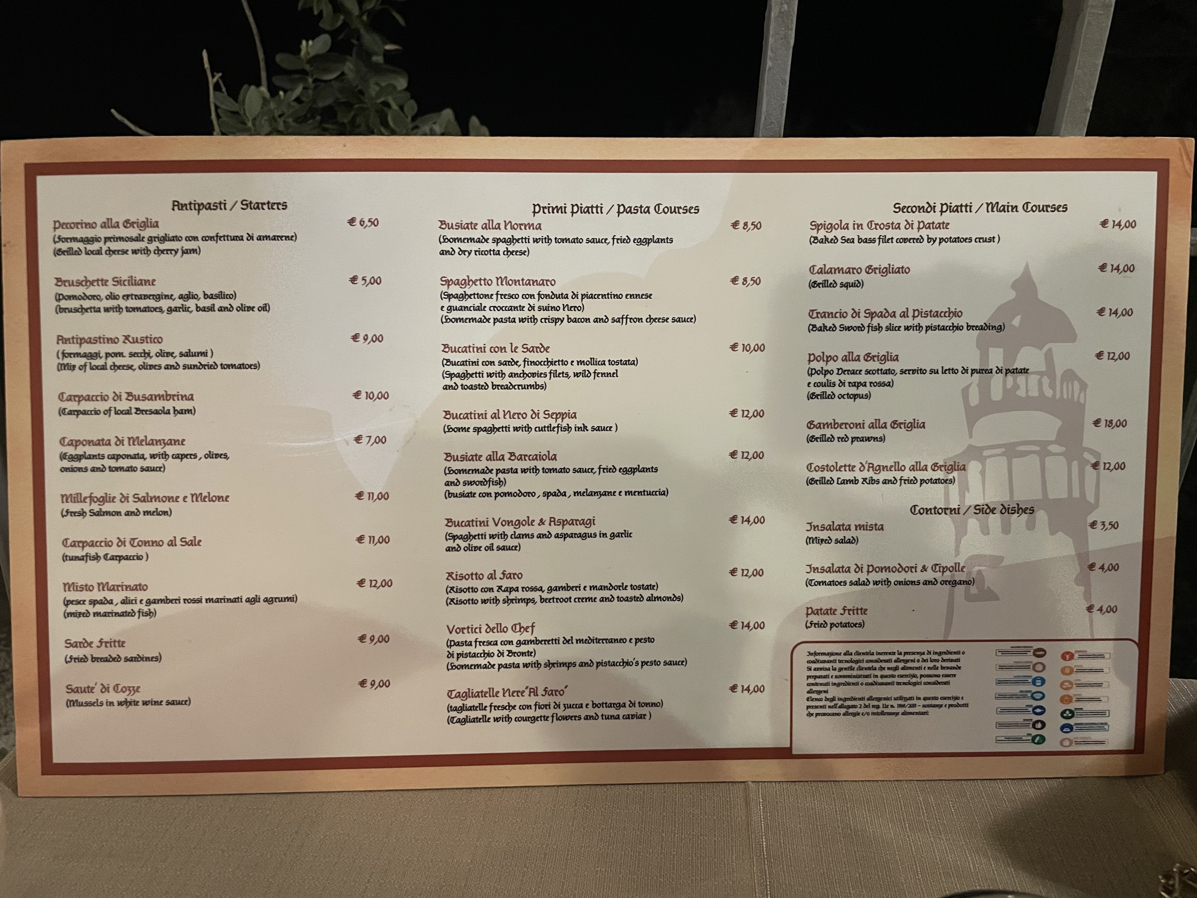 💬 Le restaurant ne saute pas aux yeux surtout dans une ville animée comme Cefalu mais alors la cuisine est succulente! Tous les plats de poisson sont frais et goûteux. Vraiment à faire si on veut bien manger sans bling bling
