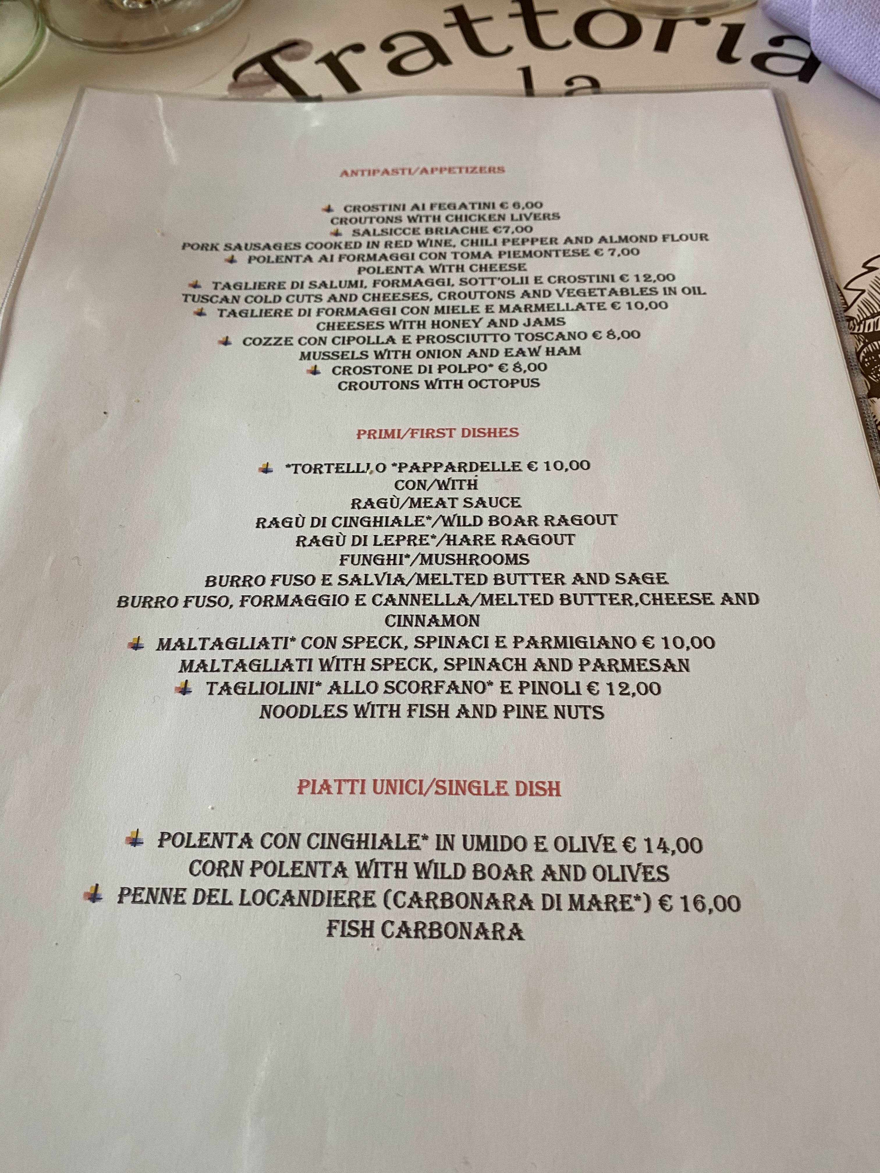 💬 Restaurant situé dans la partie historique de Suvereto (bourg médiéval) à côté d un autre restaurant. Il se compose de 2 salles et d une térasse ombragée. Parking libre à 5min en descendant. En saison, et particulièrement le week end indispensable de réserver. Carte bien détaillée (pictos vegan etc.). Plats toscans avec de l originalité. Tout était excellent. L été il y a parfois des animations extérieures (musique)