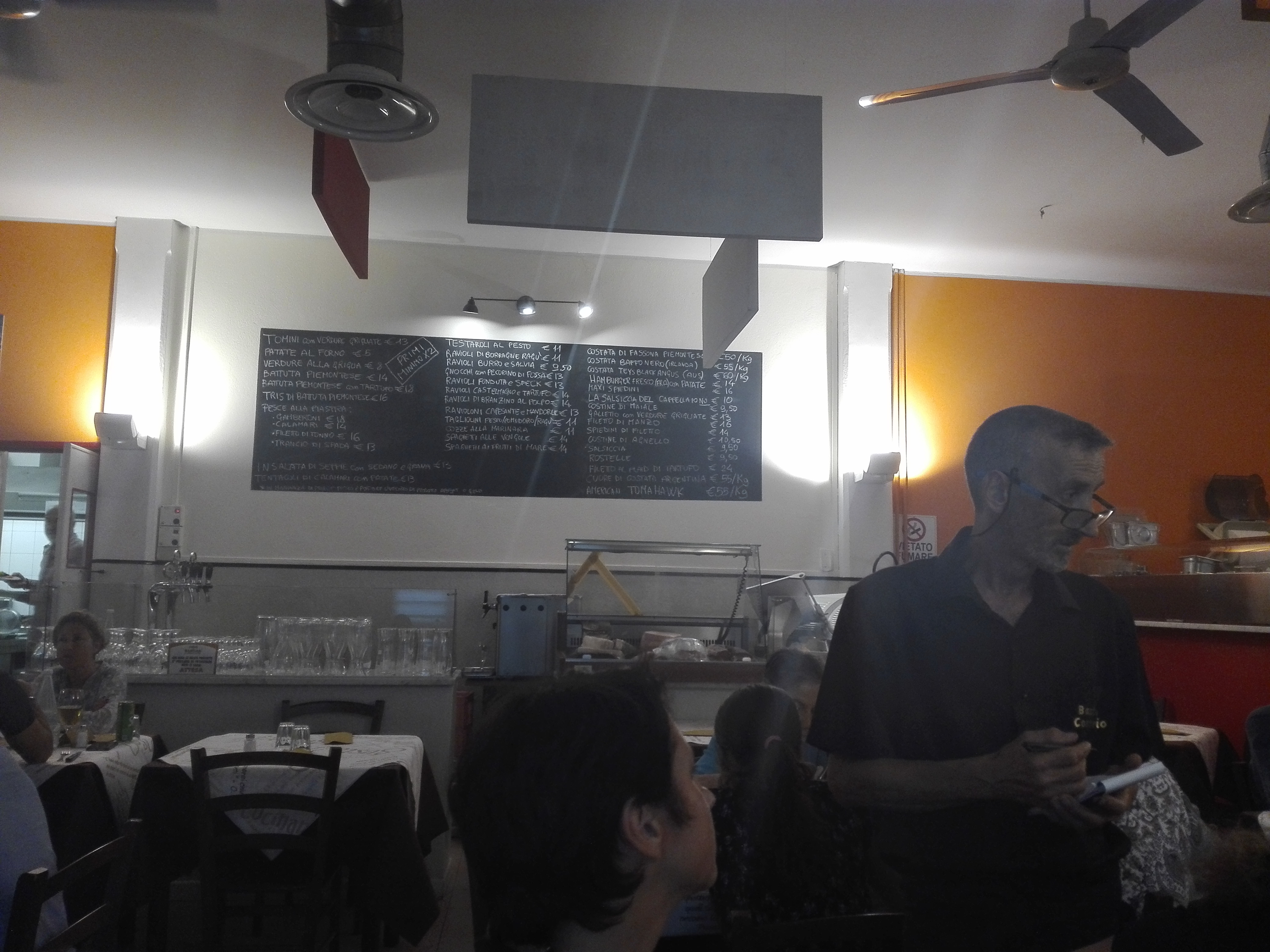 💬 Petite « trattoria » spécialisée dans les produits de la mer mais qui offre aussi un plat de viande. Personnel avenant. On est venus en famille pour un anniversaire et on a demandé un gâteau pour l’occasion. Ce que j’ai aimé particulièrement c’était le « branzino alla piastra ». C’est rare de trouver en Italie du loup de mer entier ouvert et grillé sur une plancha. Délicieux.
