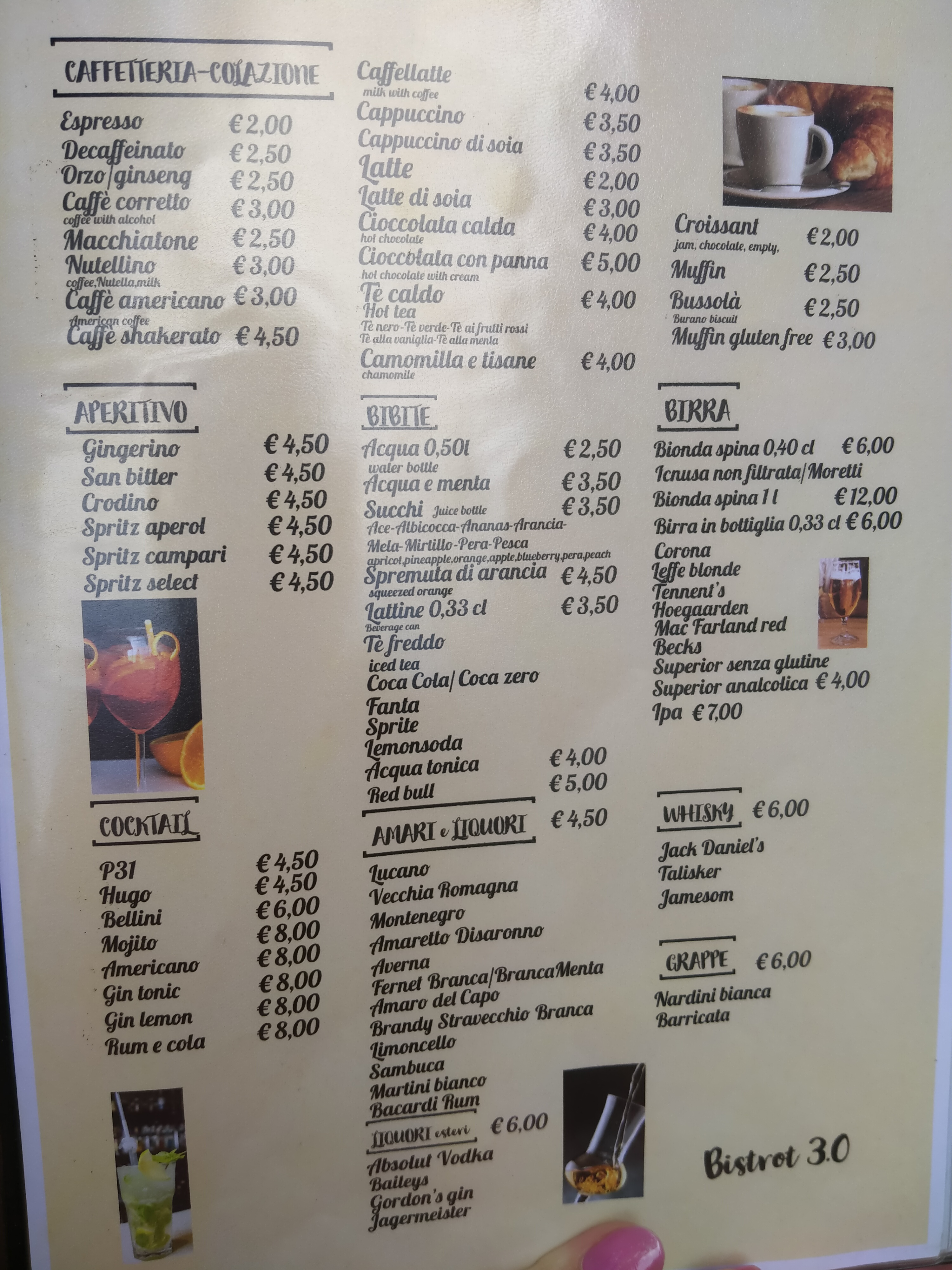 💬 65€ pour 4 plats et 3 boissons. Panini qui n’en est pas un (pain baguette bcp trop cuit), pâtes carbonara avec une sauce indescriptible et des dés de gras à la place des lardons, bière servie tiède. La pizza margarita était correcte