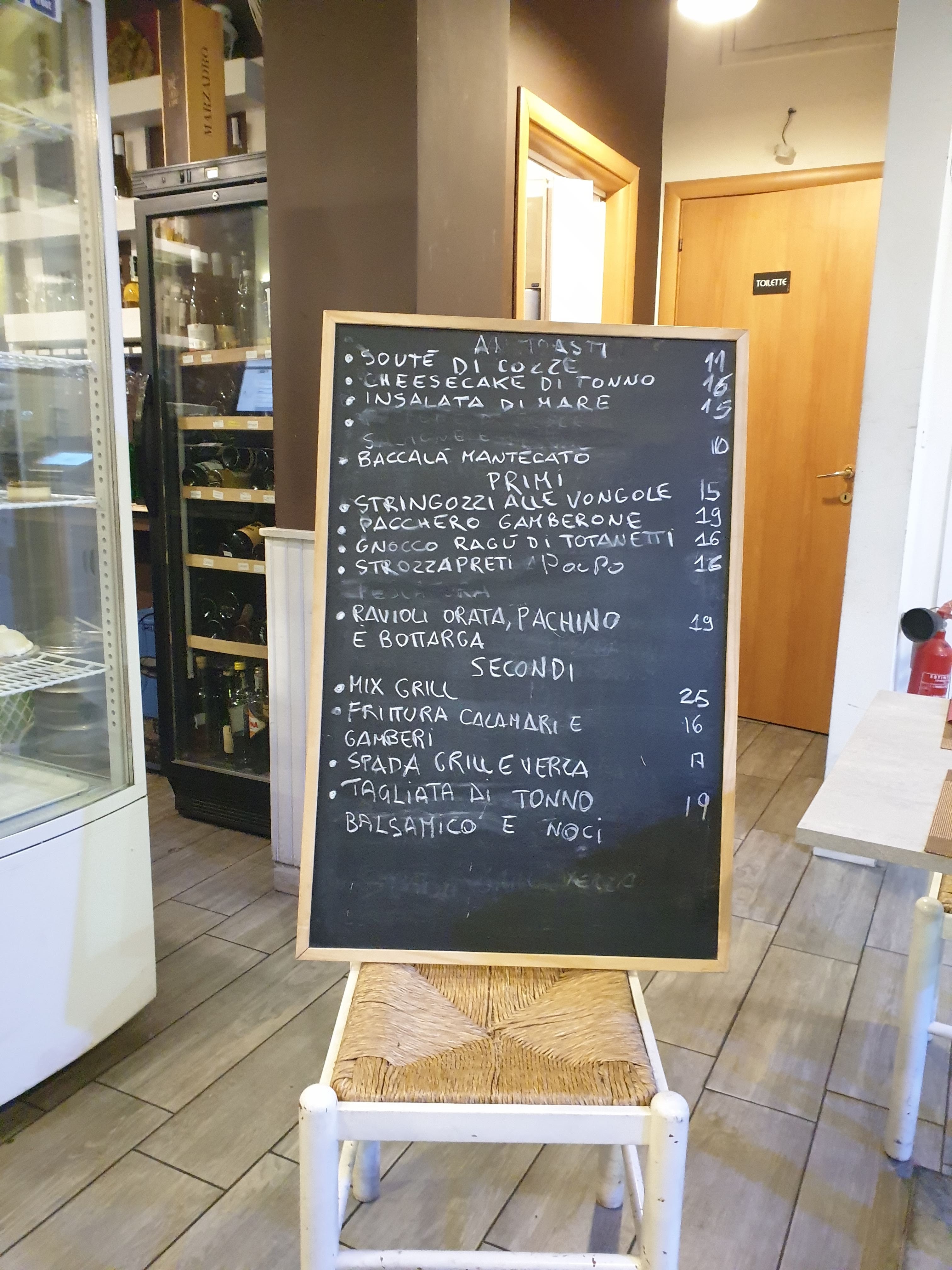 💬 Super menu à 12 euros trofie à la genevoise, filet de poisson en ragoût pdt et olives noires, salade de fruits frais, 1/4 de vin blanc frizzante et café ! Super bon, copieux !