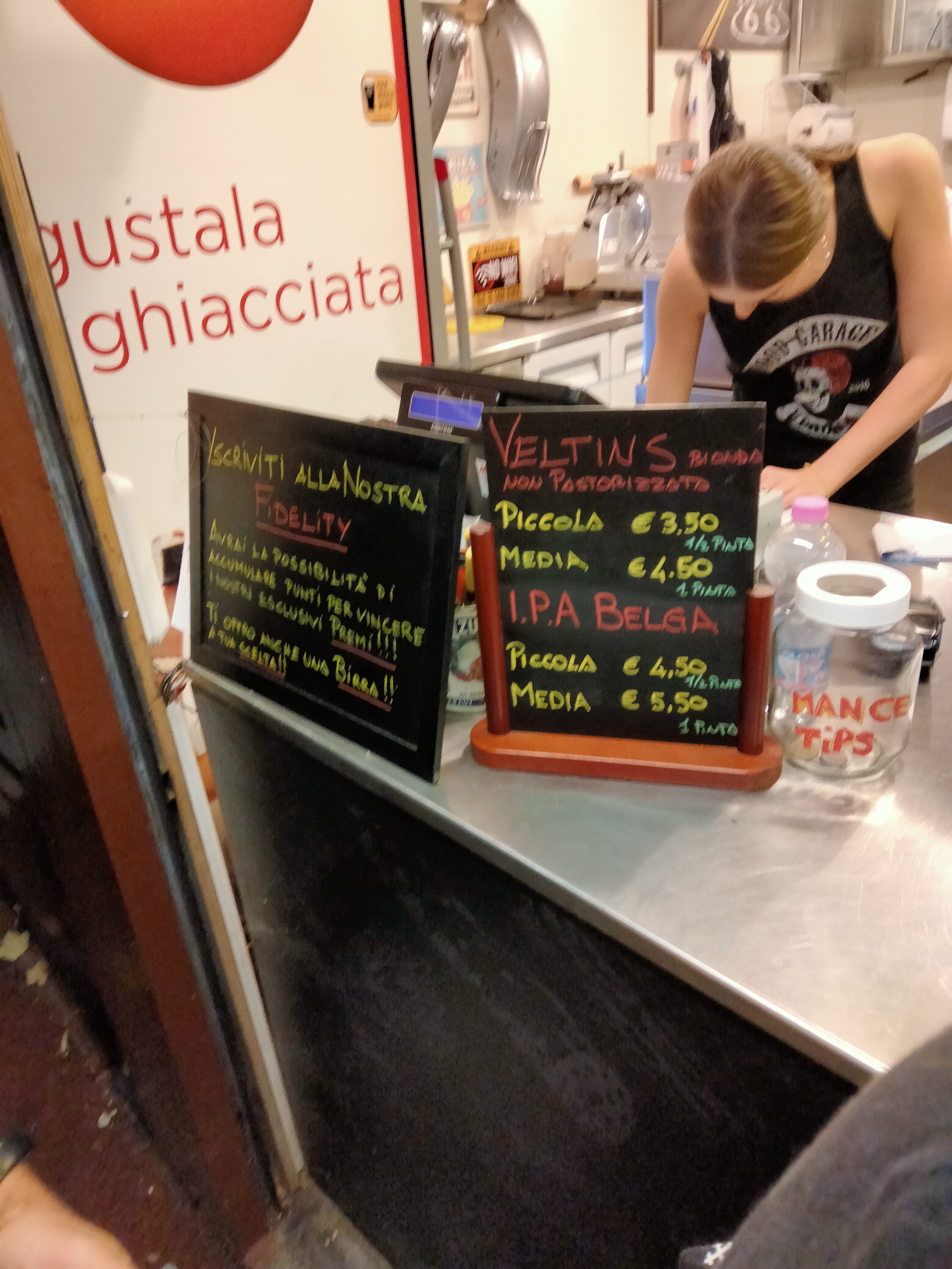 💬 Pizzeria façon pub anglais où le serveur ne parle que italien! Et il nous a installé dans la salle de l étage sans même voir nos béquilles et sans s excuser quand ils nous a vu peiner pour monter les 20 marches!!! Bons plats (escalope milanaise frites. Spaghettis à la tomate. Cheeseburger. Spagghettis a la carbonara) mais Salade composée avec sauce fade. Téléviseur avec chaîne de clips musicaux... déco sympa , ambiance cosy. Beau choix de bières.