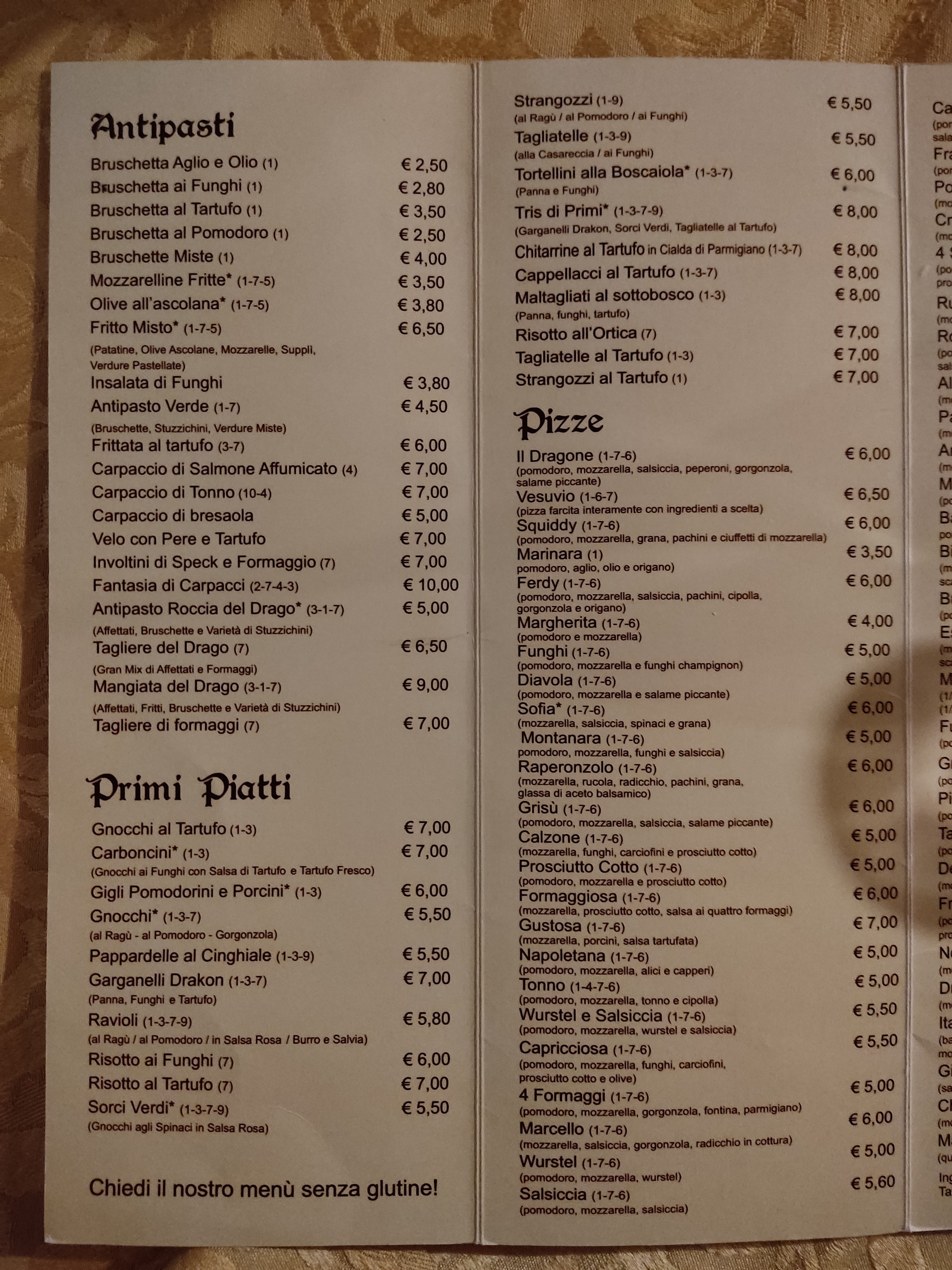 đŹ Ils sont un menu en italien seulement et j'arrive pas Ă choisir, mĂȘme les serveurs ne parlent pas anglais, les poisson sont en rupture, donc nous avons commandĂ© des pizzas variĂ©es.
