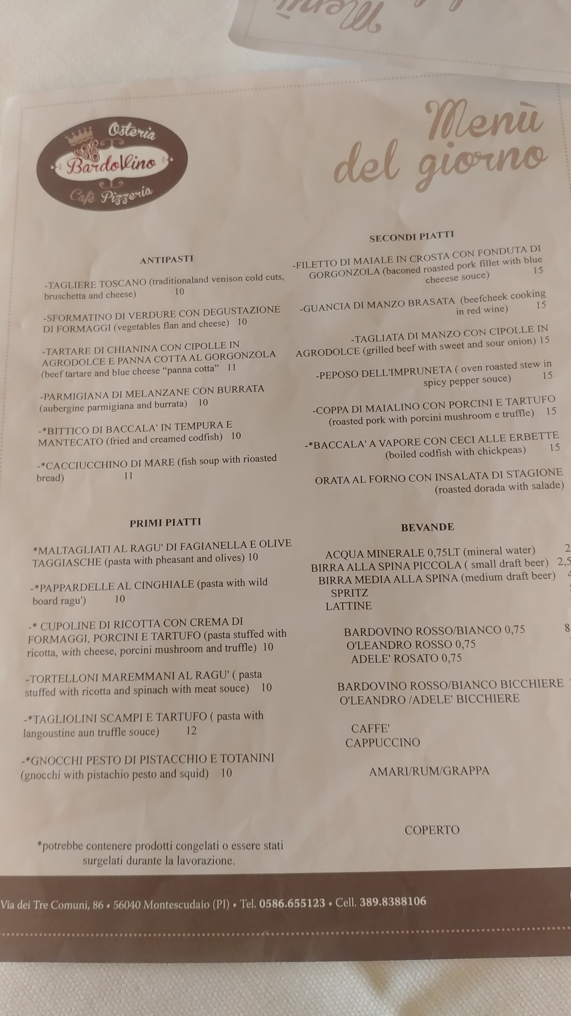 💬 Nous y sommes allés dîner selon l'instinct et les photos du web, l'endroit est correct mais un peu vieillot, nous étions deux et nous avons mangé des tagliolini aux langoustines et des steaks de sanglier, avec l'idée que les deux pouvaient être de bonnes choses car de toute façon les matières premières étaient en théorie de la région....les plats sont arrivés au bout d'une heure après la commande ce qui est vraiment trop, de plus les tagliolini étaient insipides, trop cuits et n'avaient pas le goût de langoustines, ils les avaient probablement placés là dessus seulement à la fin de la préparation des pâtes aux tomates...les steaks de sanglier étaient trop cuits et n'avaient pas beaucoup de saveur, globalement une catastrophe, le seul point positif était le vin rosé qui nous a surpris et aussi le dessert cependant Nous ne le recommandons pas et n'y retournerons jamais.