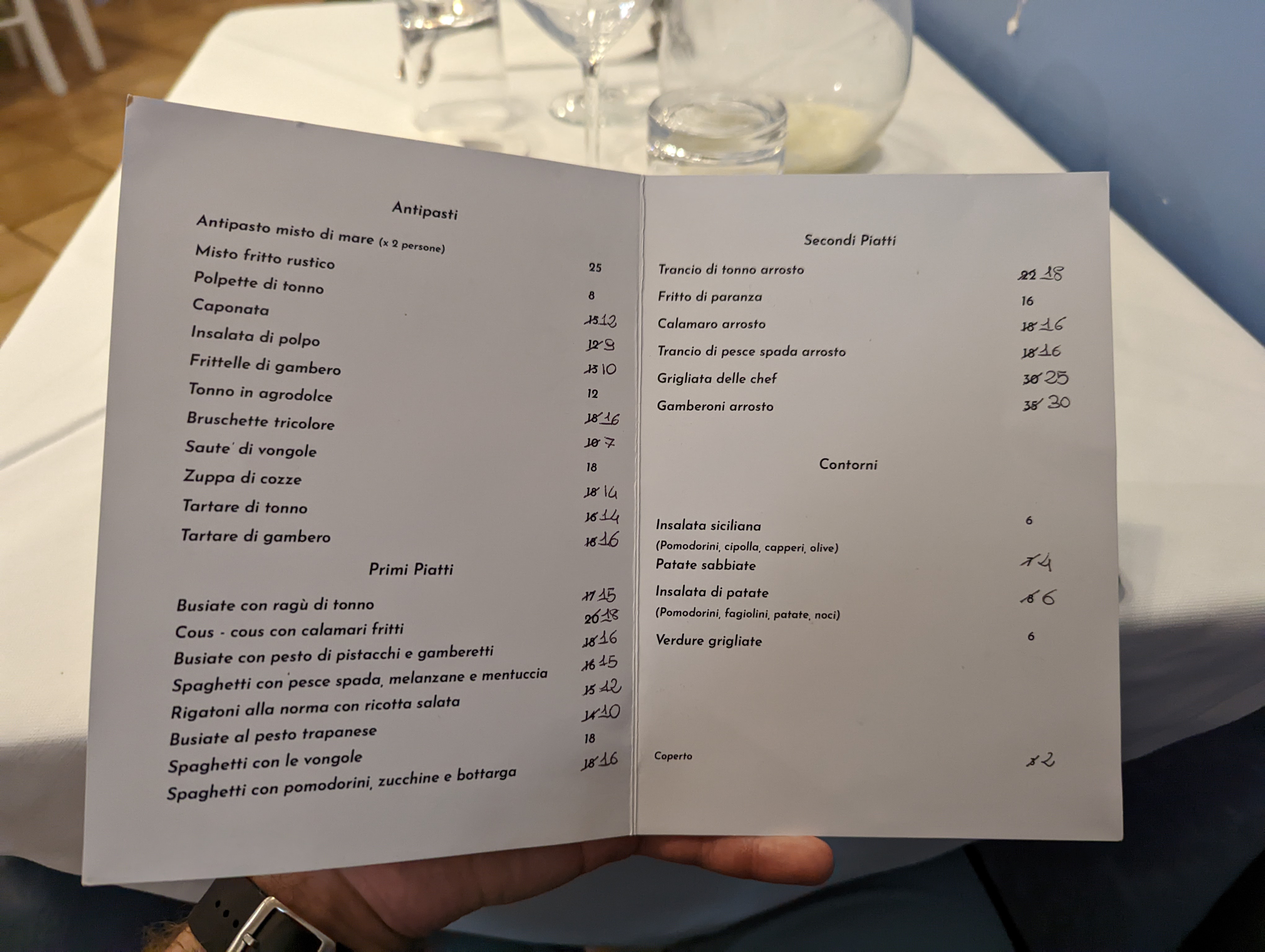 💬 Ici, on mange dans une osteria typique fréquentée par les siciliens, avec vue sur un vaste choix de bouteilles de vins. Les pâtes au pesto trapanese sont excellentes. Le service est impeccable et les deux serveurs furent très sympathiques et souriants. Merci à eux pour le petit verre de limoncello en fin de repas !