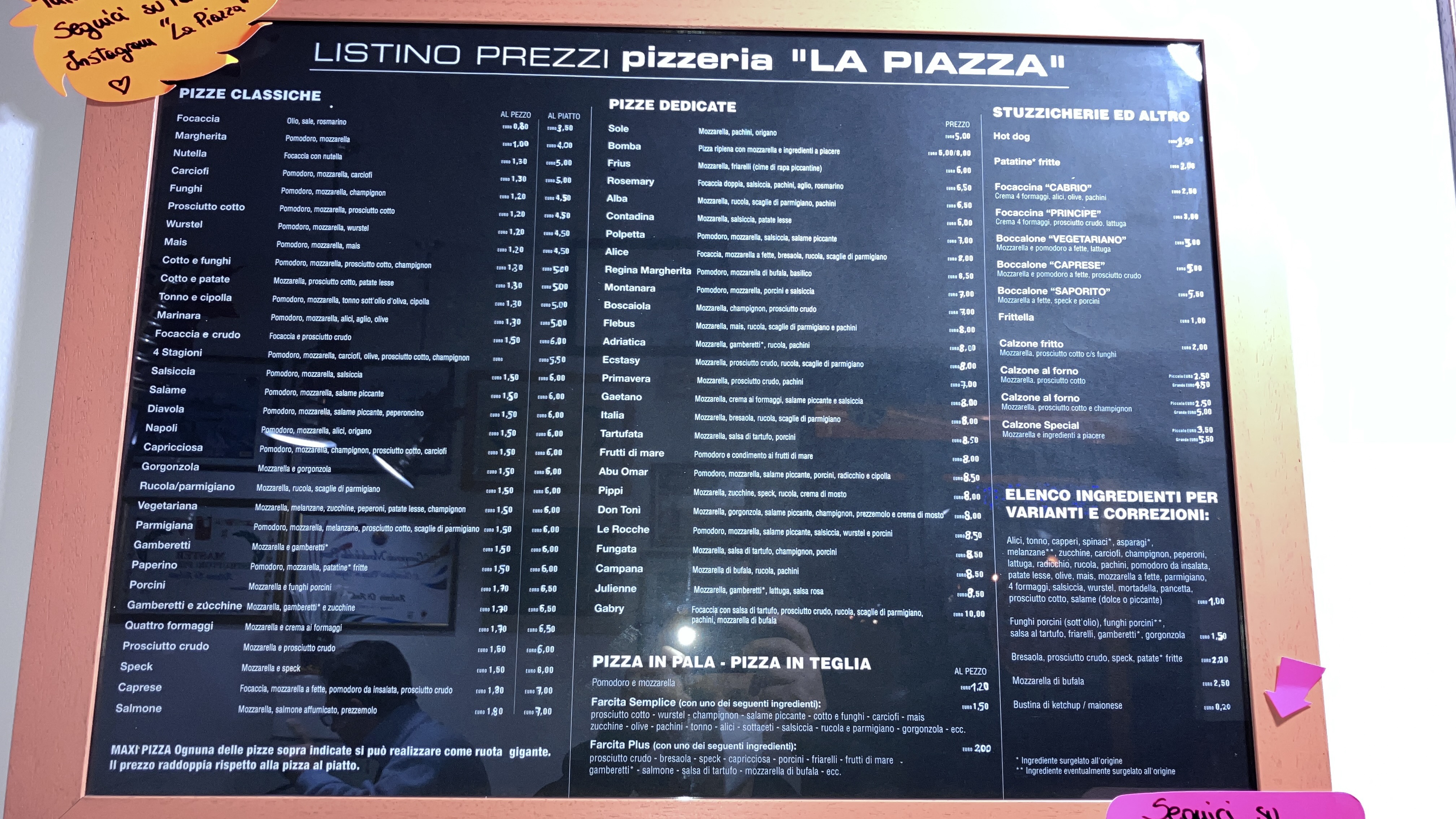 💬 Lieu très rustique, l'apéritif est accompagné de diverses pizzas/focaccias très savoureuses, mais froides. En commandant des pizzas au comptoir, elles sont également servies froides, les clients se chargeront de les réchauffer au micro-ondes. Compte très économique.