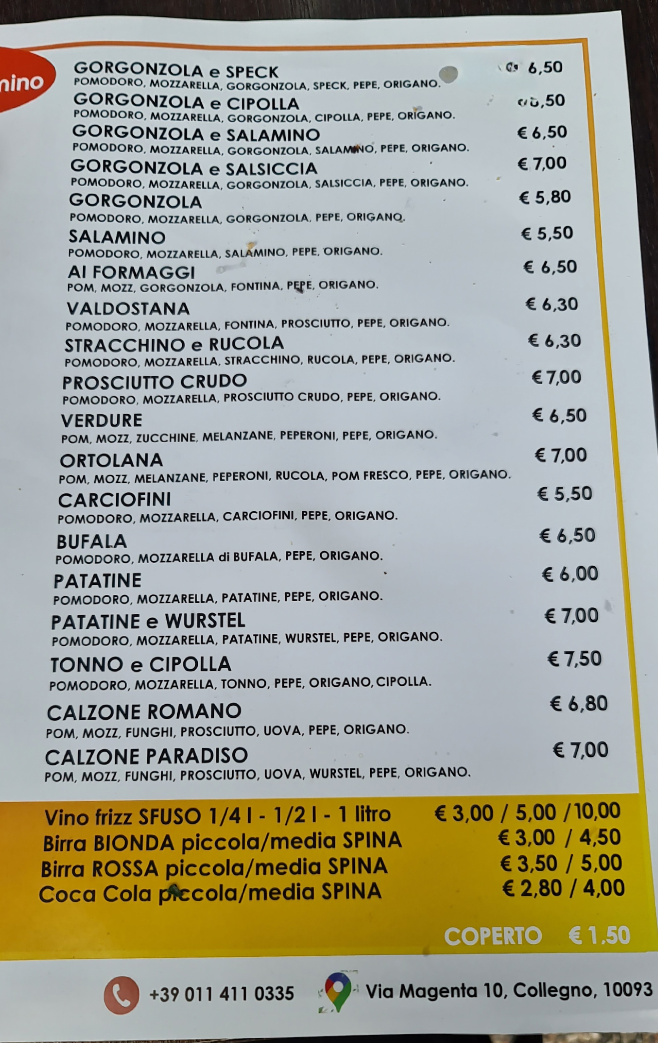 💬 Accueil sympathique Large choix et prix très attractifs Entre 6 et 10 euros selon la pizza Petite inconfort à l'étage avec l'odeur un peu forte de l'activité du four.