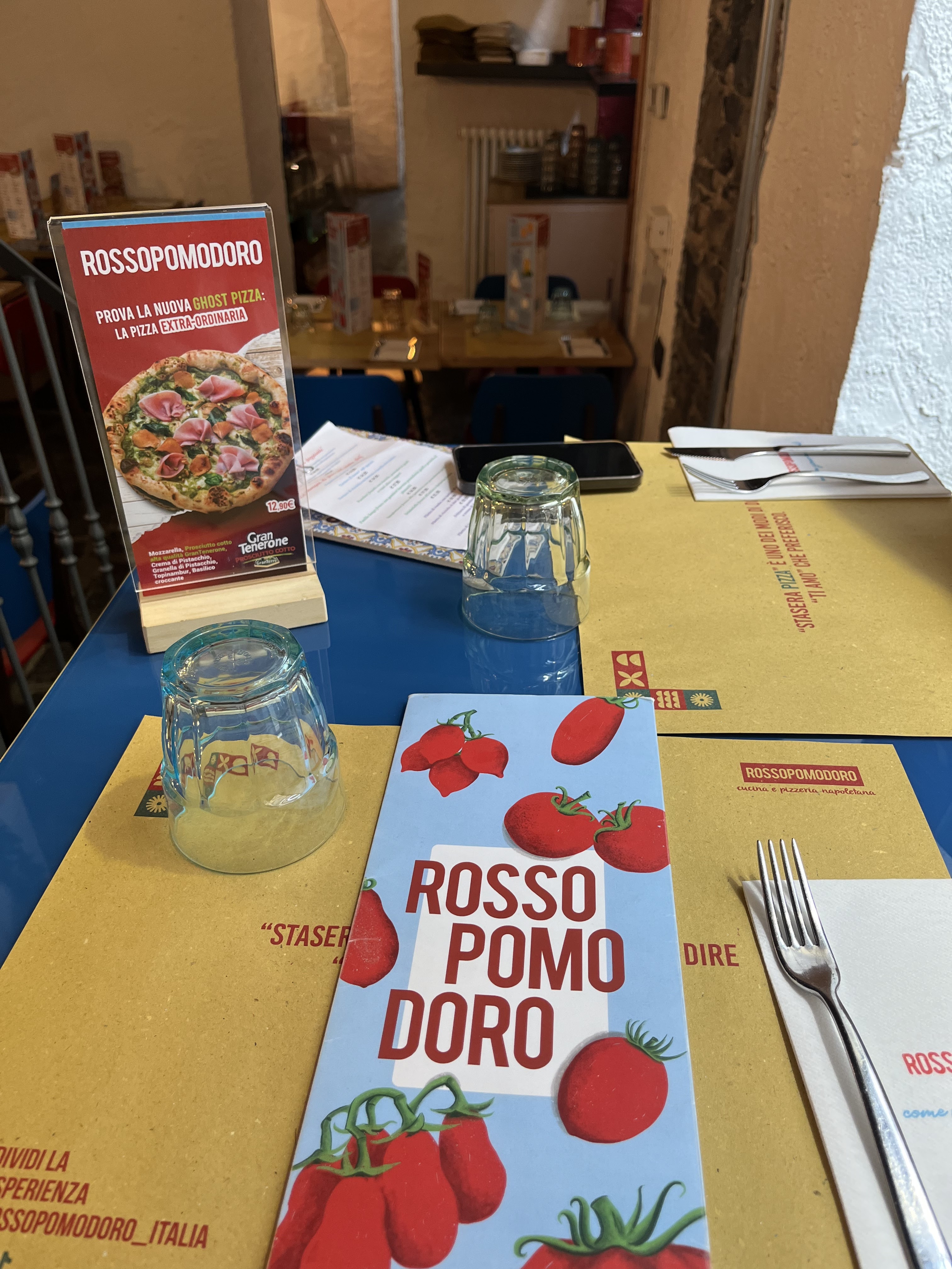 💬 Très bonne pizza avec pâte moelleuse. Cependant un peu trop frais car proches de la porte fenêtre, donc pas très isolée. Thème de la déco sympa avec tous les ingrédients de la symbolique Naples.