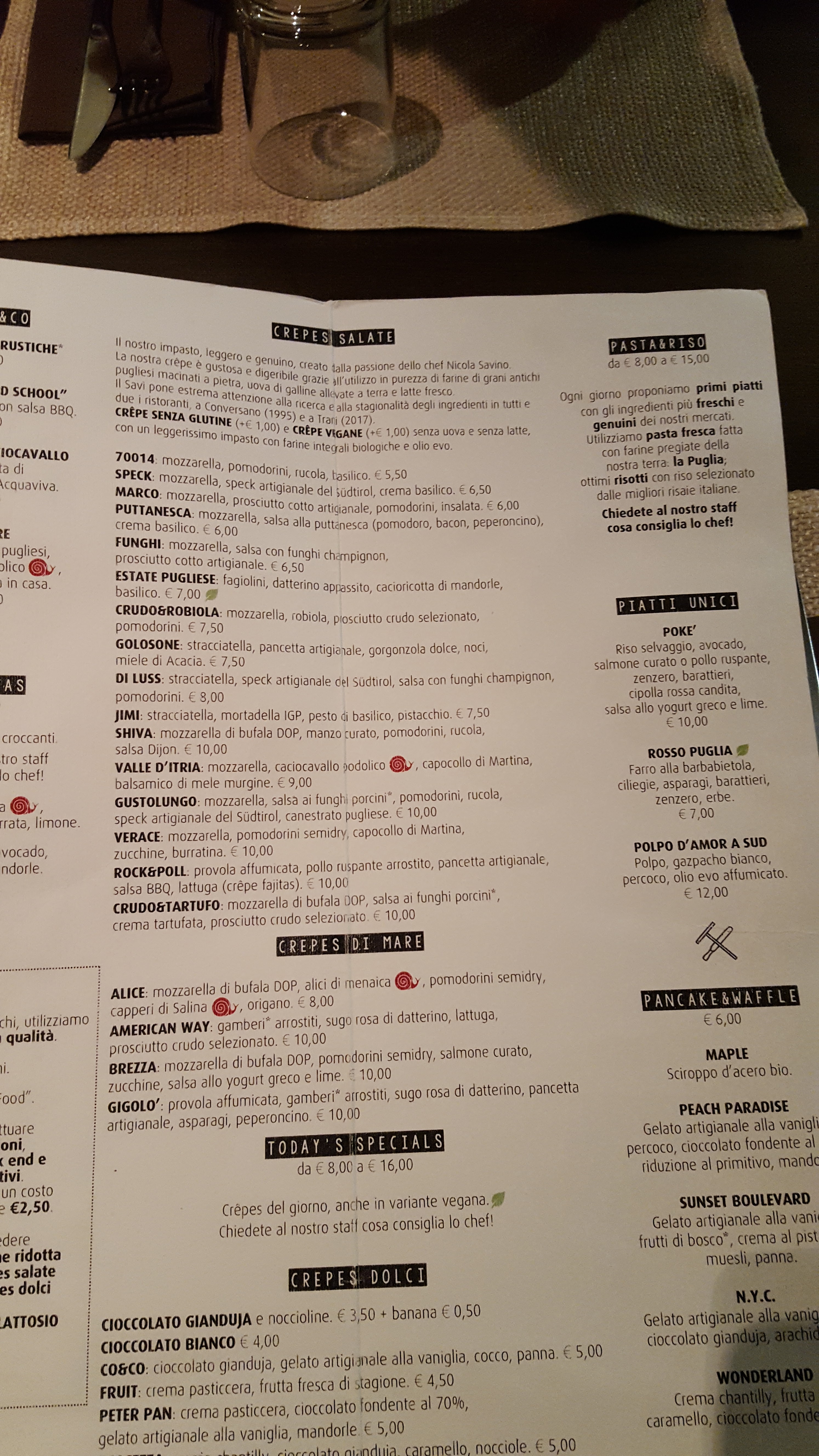 💬 Nous avons dîné ce soir dans cet endroit de Conversano sur la recommandation de quelques proches. Il s'agit d'un établissement affilié à l'AIC (Association italienne de la maladie coeliaque), en effet une grande attention est accordée aux diverses intolérances et aux différents régimes alimentaires. Les propriétaires devraient être récompensés. La carte est assez vaste, depuis les entrées, en passant par les entrées et ensuite les crêpes sucrées et salées. Il y en a pour tous les palais. Nous avons dégusté des crêpes aussi bien sucrées que salées et je suis heureux de constater la taille et l'abondance ainsi que la qualité des matières premières utilisées. L'endroit est très sympa, le service est assez rapide. J'y retournerai certainement avec grand plaisir.