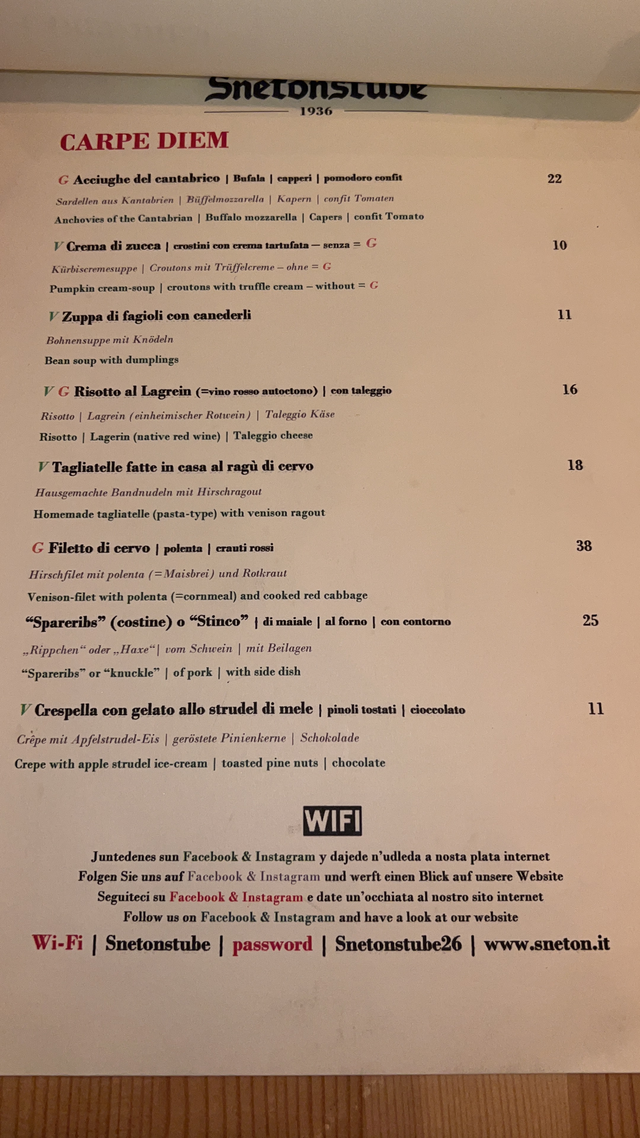 💬 Très bon moment. Les plats sont délicieux, les quantités sont bien adaptées (plat + dessert) et les serveurs nous apportent conseils et bonne humeur tout au long du repas. Bref si vous passez à Canazei je vous recommande de vous attarder quelques heures à l’une de leurs tables!