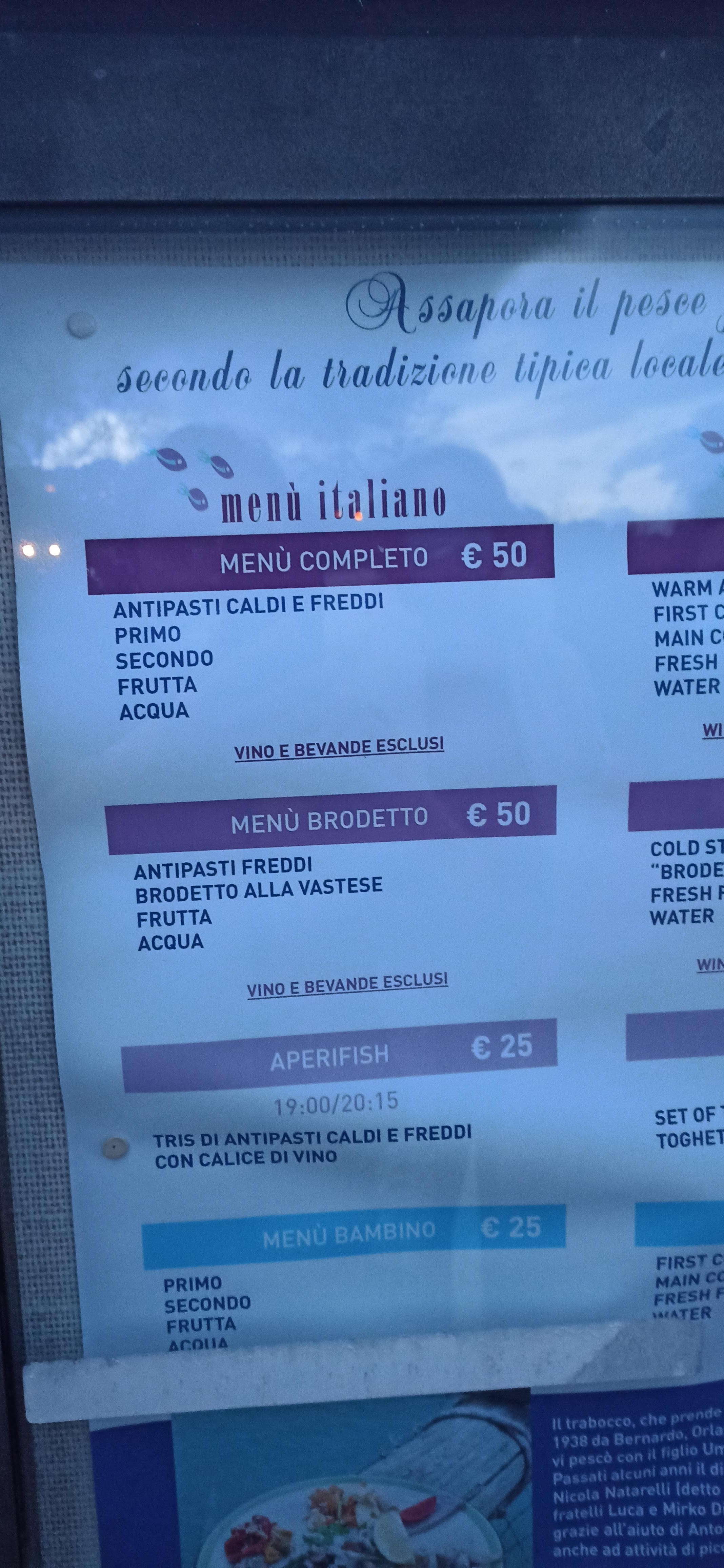 💬 Restaurant sur la digue de Vasto Marina très correct . On y peut déguster de très bonnes Bruschetta de 1m de long ! Personnels souriant et très gentil . Ils font également l'effort de parler quelques mots français .