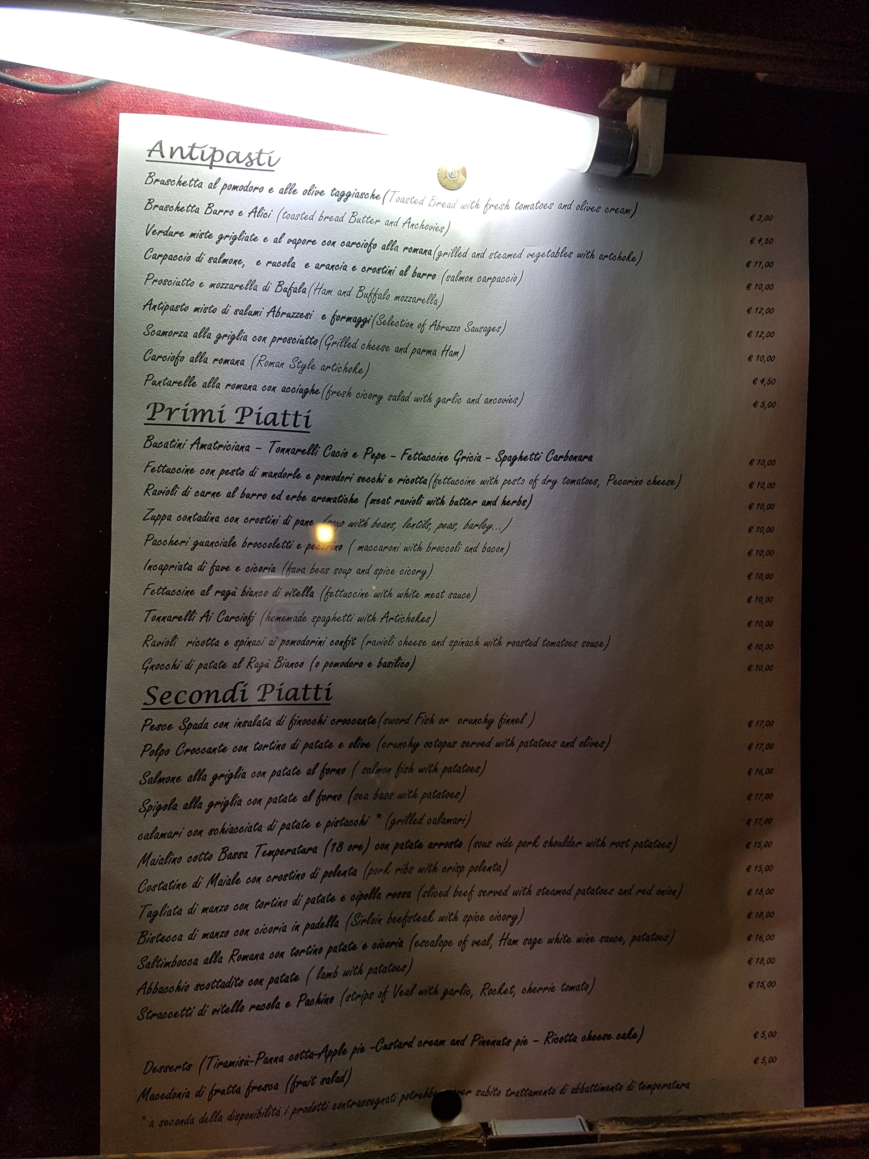 💬 Restaurant charmant ! La décoration aurait besoin d'un petit coup de neuf ! Si vous ne parlez pas italien, vous avez absolument besoin de Google Translate car le menu est en italien. Bon choix de nourriture, j'ai du saumon, des chips et un verre de vigne Tout était délicieux et très bon marché Je recommanderai