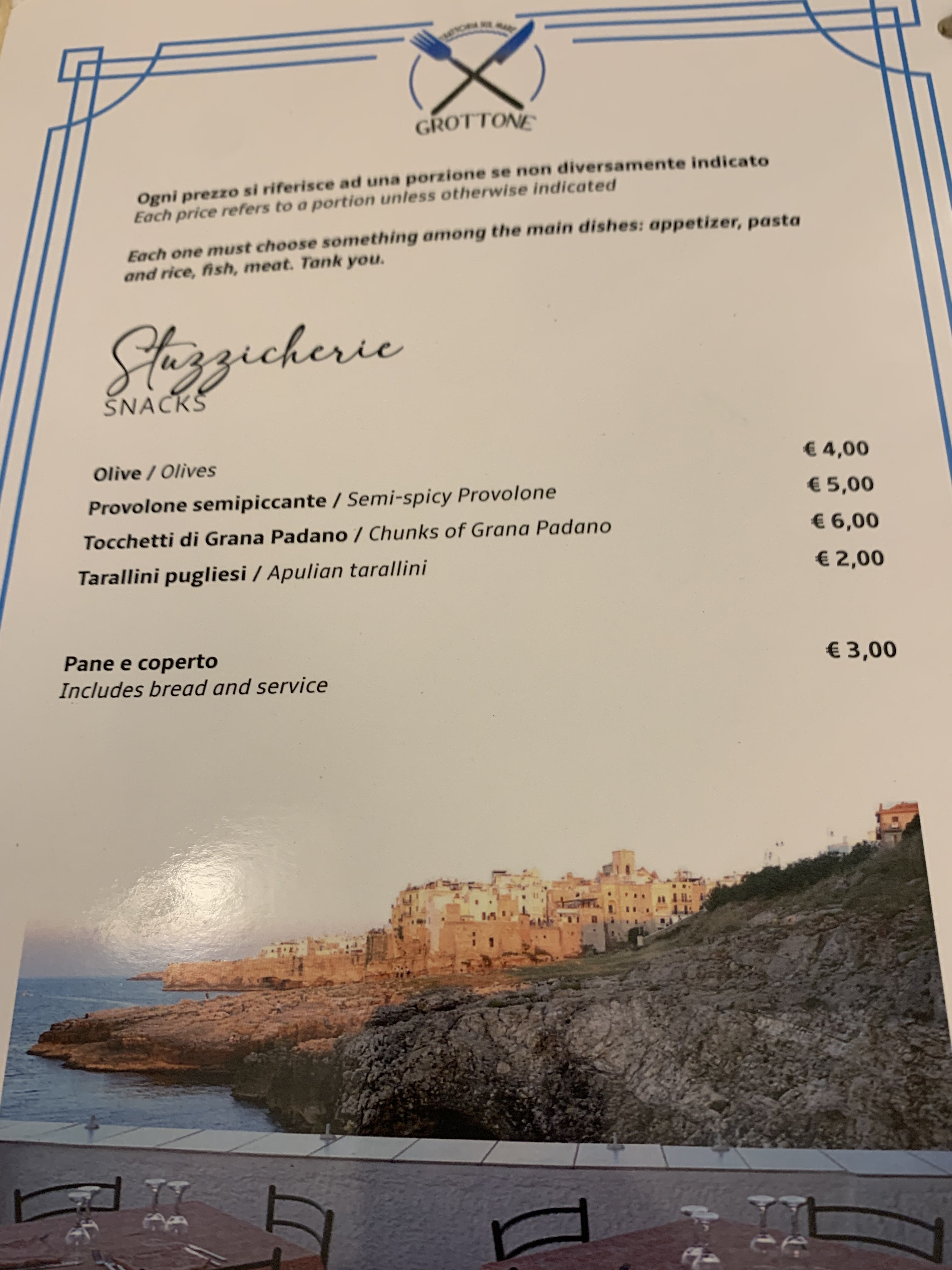 💬 C’est dommage la vue est belle , vue sur la plage monachile, il était 12h, nous pouvions prendre que des boissons, pas tout en plus, pas de cappuccino, pas d’orange pressée, nous avons dû prendre 1 spritz et 1 jus d’orange pour 10€, prix corrects, mais dommage on voulait prendre une planche apéro.