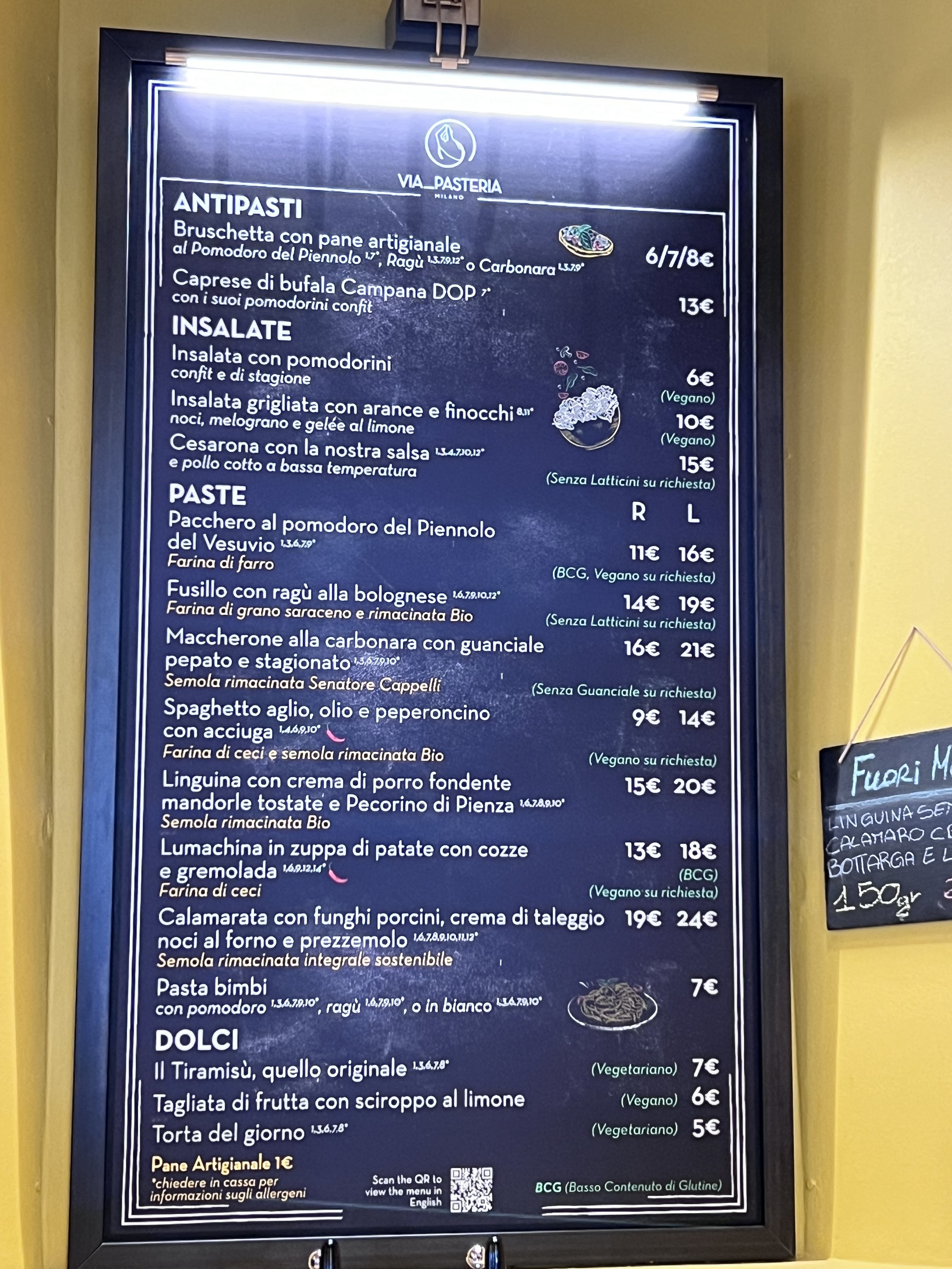 💬 Restaurant très cool et tendance. Personnel super sympathique (merci au jeune serveur tatoué 👍) Très bonnes pâtes carbo et Spritz passion. Pain payant 2€ un peu cher pour du pain on aurait aimé savoir avant et boissons servît après le plat dommage sinon c'était parfait. Eau gratuite comprise ce qui est rare a milan.
