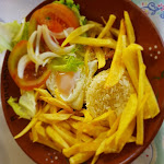 A comida era ... ok, mas um pouco bagunçada. Bife com batatas fritas e salada. O bife era ultrafino, nadando em óleo e azeite da salada. Um pouco em todo lugar. Os proprietários falam alto como todos os portugueses, não se importem com isso. Duas porções com coca-cola, 27€. Os banheiros são fedorentos e minúsculos. Existem restaurantes melhores e mais baratos num raio de 500mts.